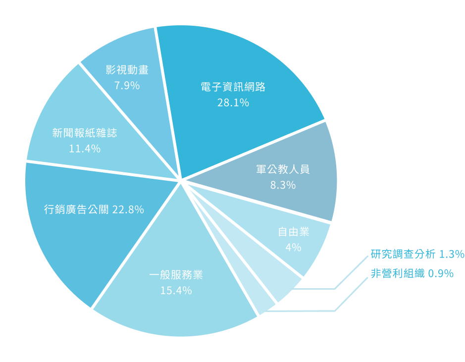 投入就業市場的大學部畢業生,就職領域多元且廣,「電子資訊網路」、「行銷廣告公關」、「一般服務業」(如,航空、電信、金融保險等)為前三大就業領域。依次為新聞雜誌報紙產製、軍公教人員,及影視服務與 動畫製作。畢業生的就業多元化,顯示傳科系訓練課程與技能,與就業市場接軌, 能因應各領域對專業人才的需求。下圖為97級至107級碩士班畢業生去向調查結果。